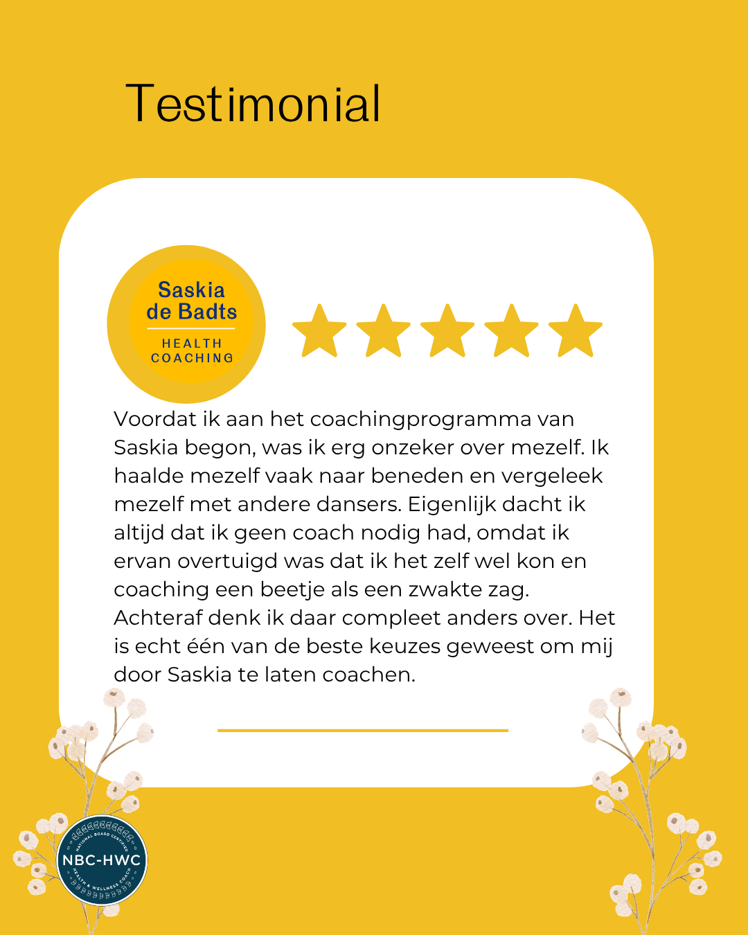 Saskia is een geweldige coach. Ze beheerst alle didactische skills, is een goede luisteraar en vooral een liefdevol en warm mens. Ik wens iedereen een coach zoals Saskia